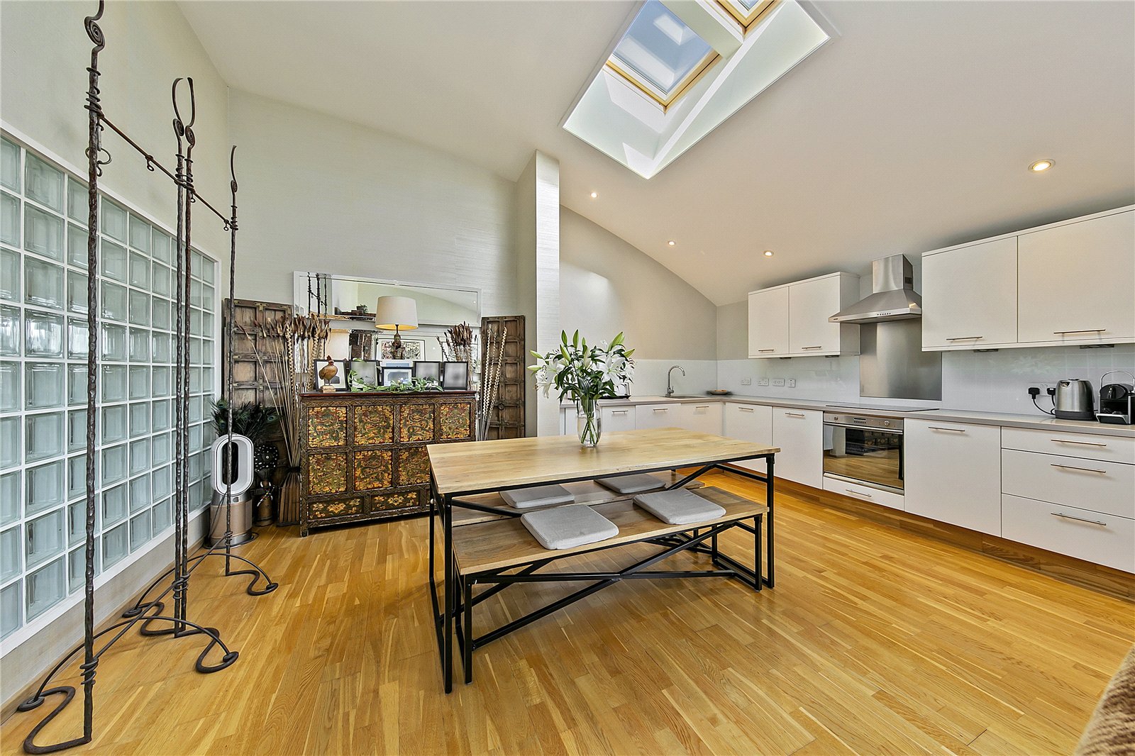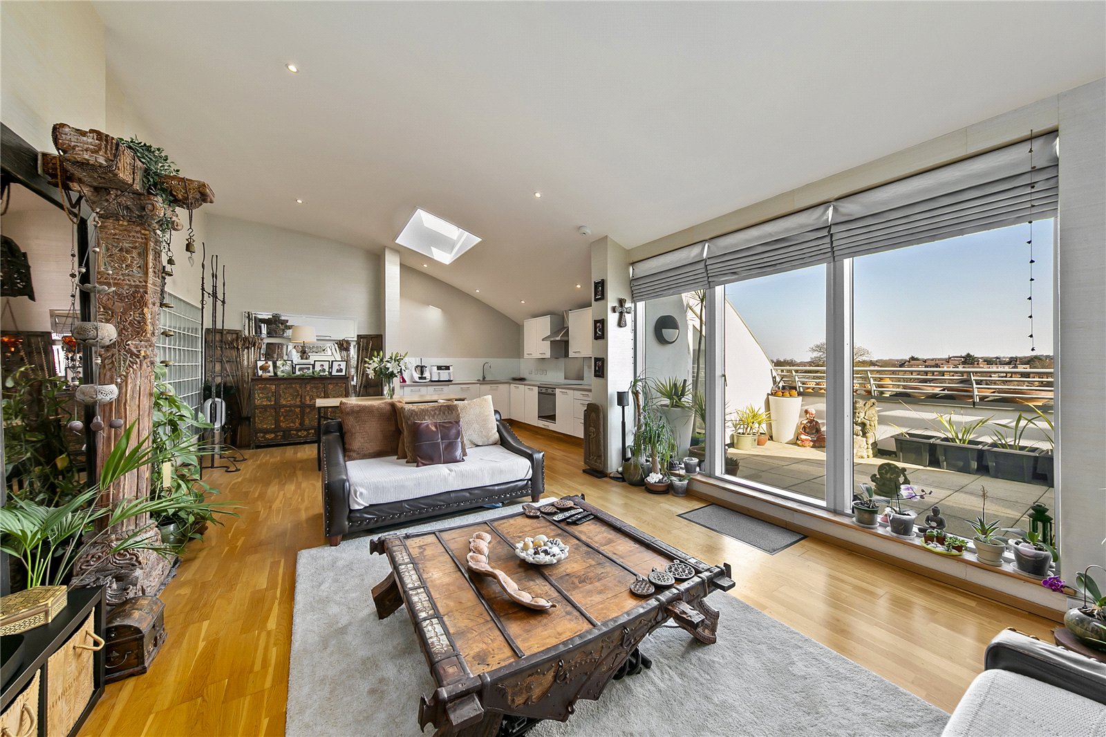 This impressive apartment offers generous living accommodation and clever storage throughout. The open-plan living and kitchen area is flooded with natural light, while the living room boasts a large domed ceiling creating a spectacular airy environment and a real sense of space.