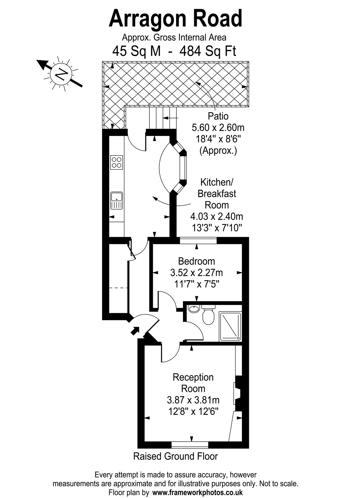 The accommodation comprises one bedroom with fitted wardrobe, shower room, large reception room, and a galley kitchen. The flat also benefits from a patio area to the rear.