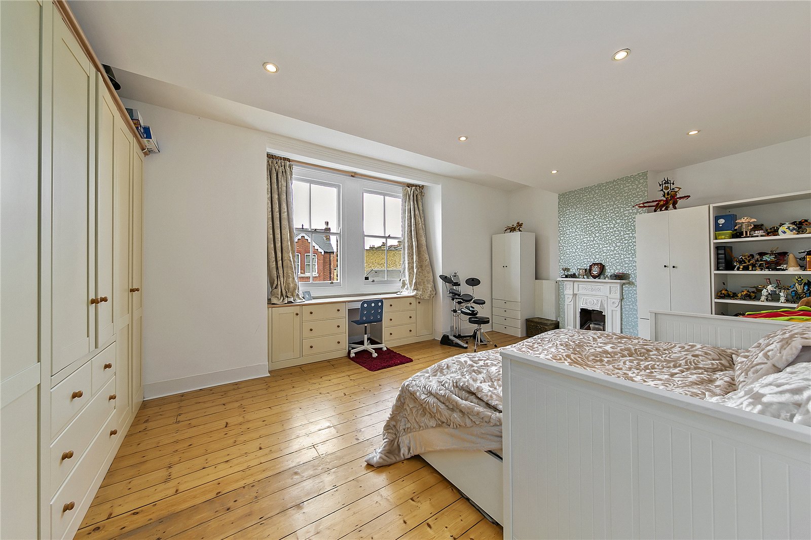 On the first floor there are three bedrooms and the main bathroom: a full-width principal bedroom with bay window and fitted wardrobes to the front, a good sized second bedroom behind, then the third bedroom to the rear, overlooking the garden.