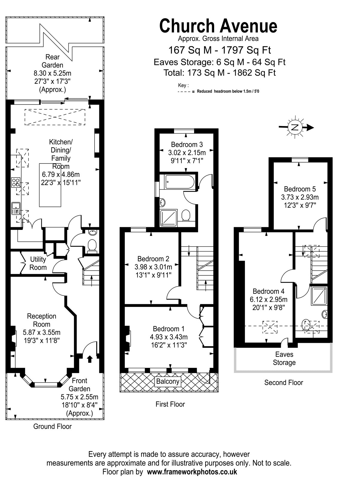 The first floor houses three bedrooms (two doubles and a single) and a modern family bathroom, with a balcony directly accessed from the principal bedroom, with two further double bedrooms and shower room/WC on the second floor.