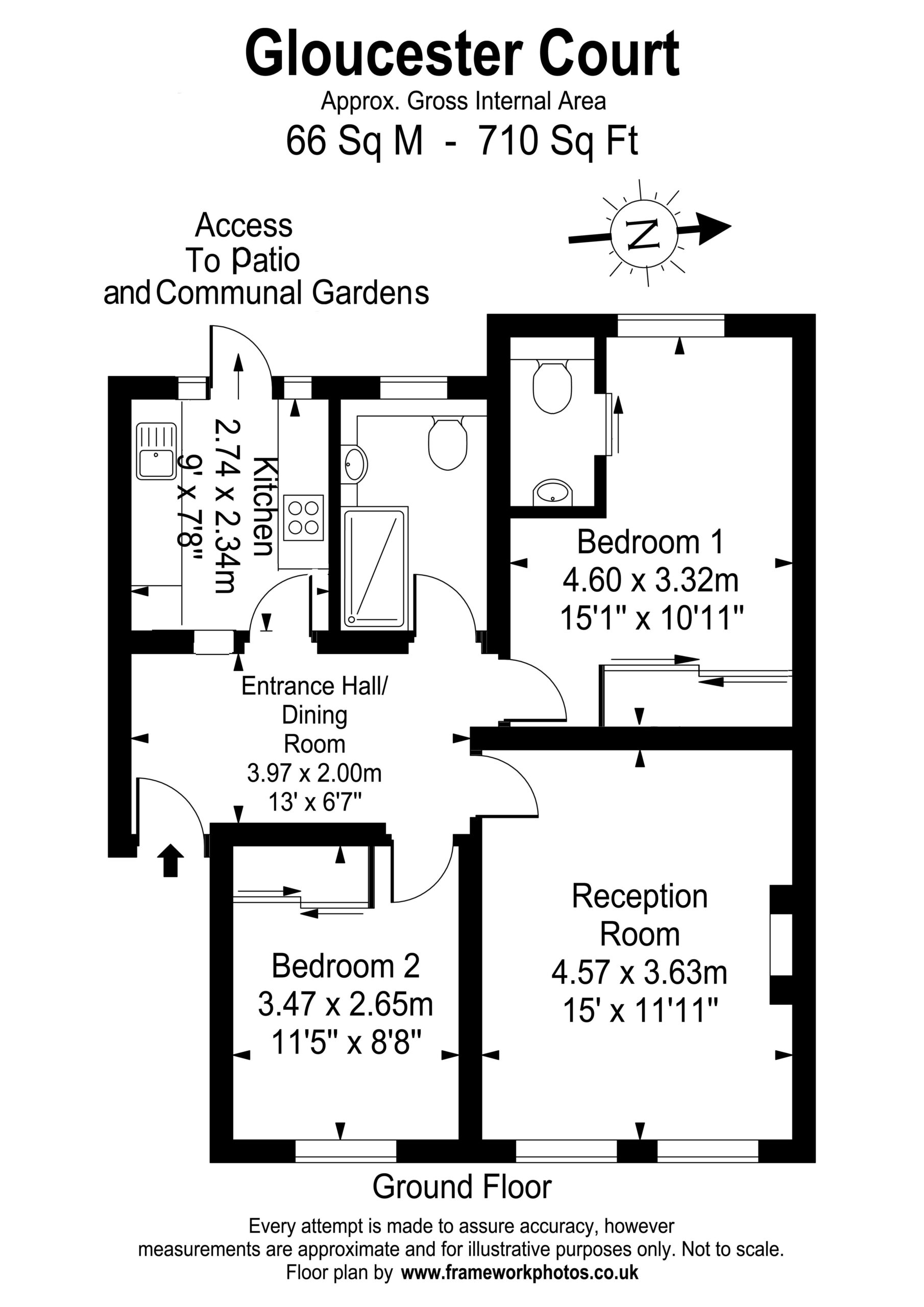 Exceptional two double bedroom ground floor flat advantageously situated within the court and benefiting from direct access to the rear onto the patio area and the residents’ walled gardens.
