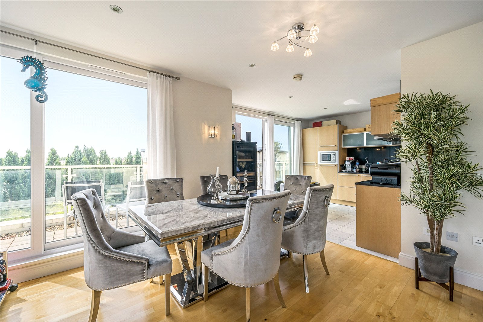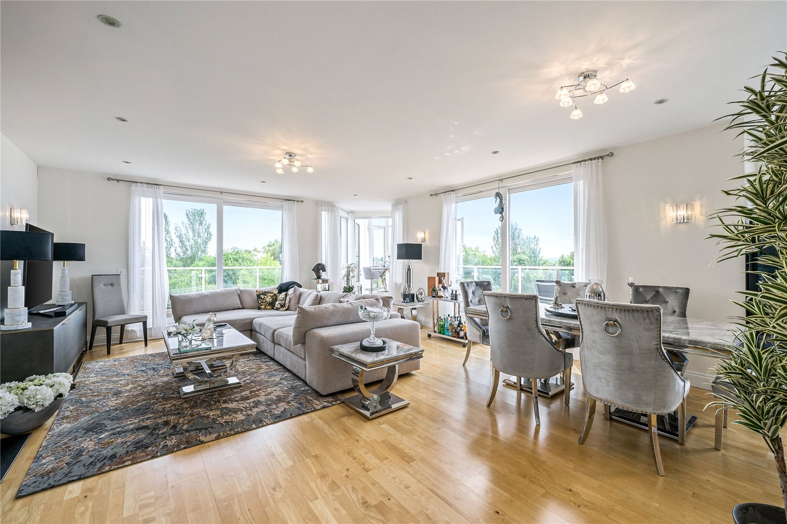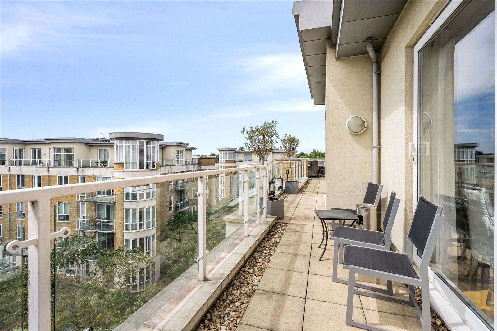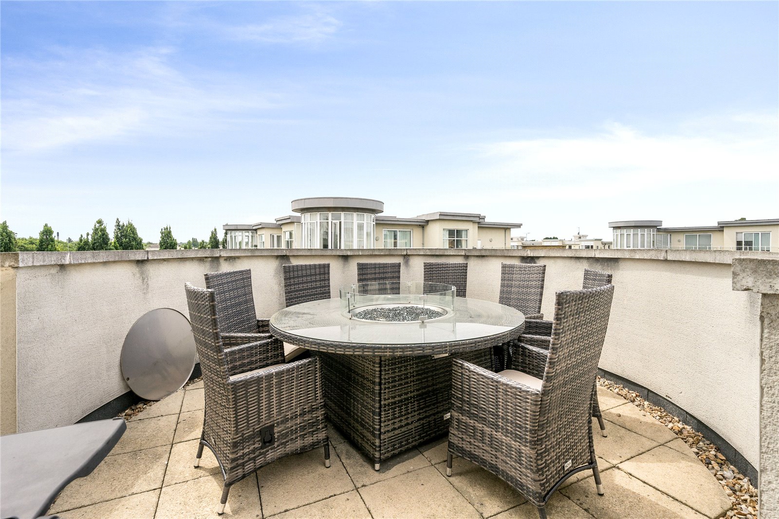A high specification penthouse apartment with extended roof terrace overlooking the River Thames at the prestigious Kew Riverside Development. 3 double bedrooms (2 with ensuite bathrooms), further family bathroom, modern fully fitted kitchen leading to sitting/dining room with rotunda style conservatory and wood floors throughout. Allocated underground car parking and use of on site leisure facilities, concierge service and landscaped gardens.