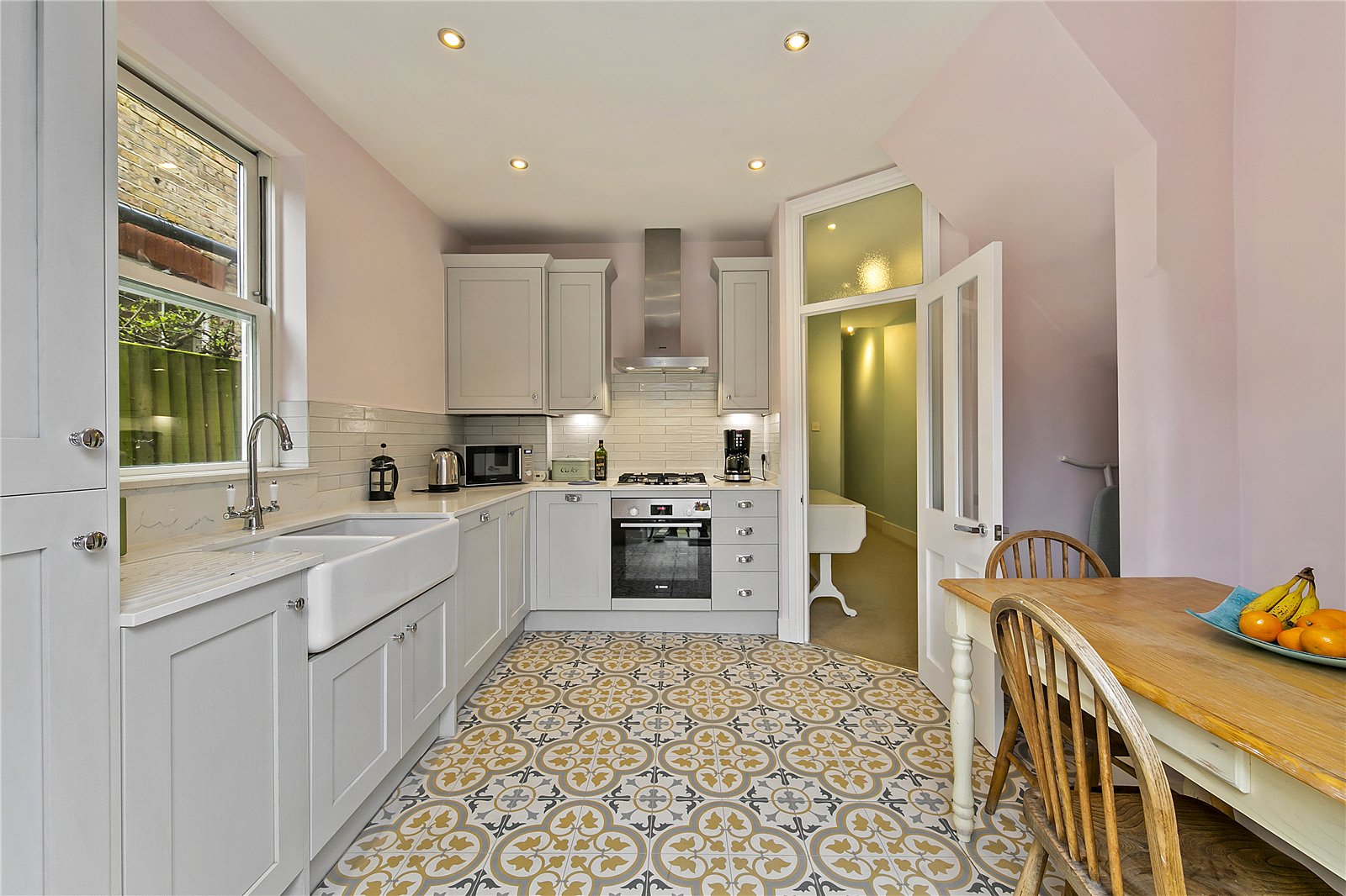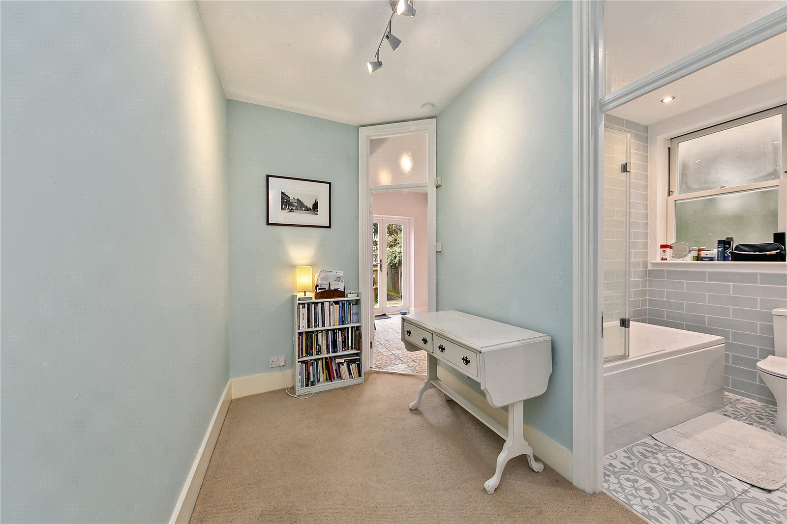 The layout is ideal as the kitchen/breakfast room, which has just been re-fitted, is at the back with double doors opening to a private South facing garden with rear access.