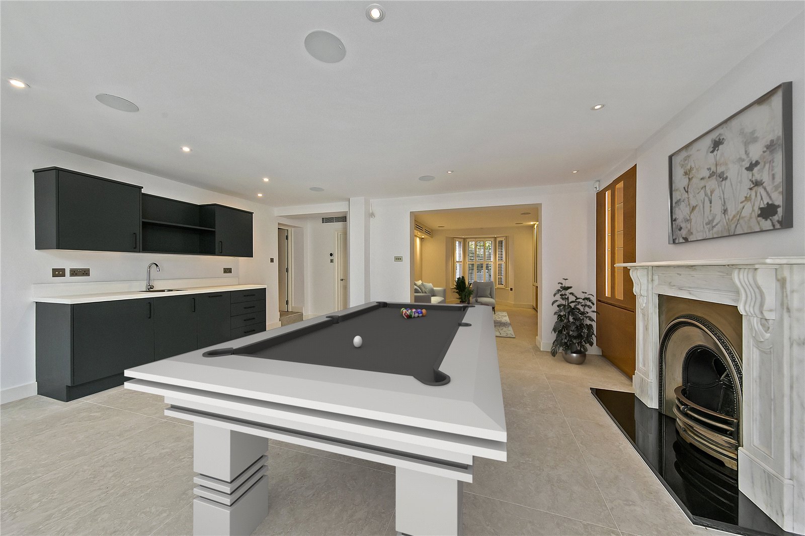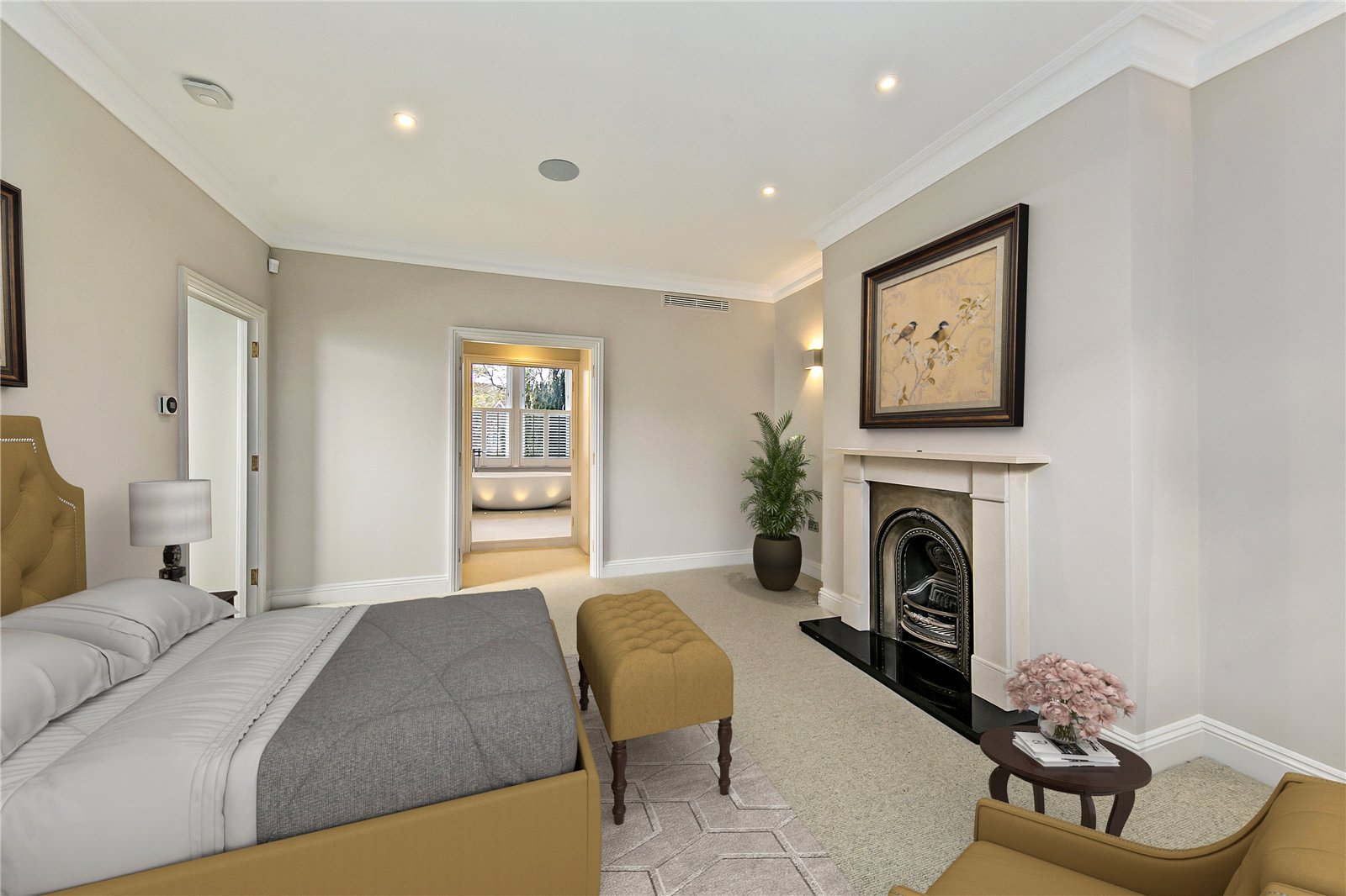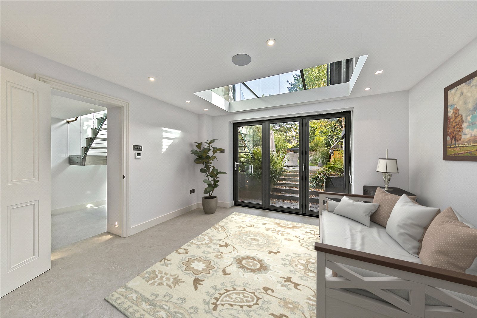 The brand-new Mowlem and Co. kitchen is at the front of the house with bay window and featuring Sub Zero Fridge, Wolf oven, wine cooler, boiling tap and top of the range appliances and finishes. The dining room overlooks the stunning garden with glass conservatory style space for your morning coffee.
