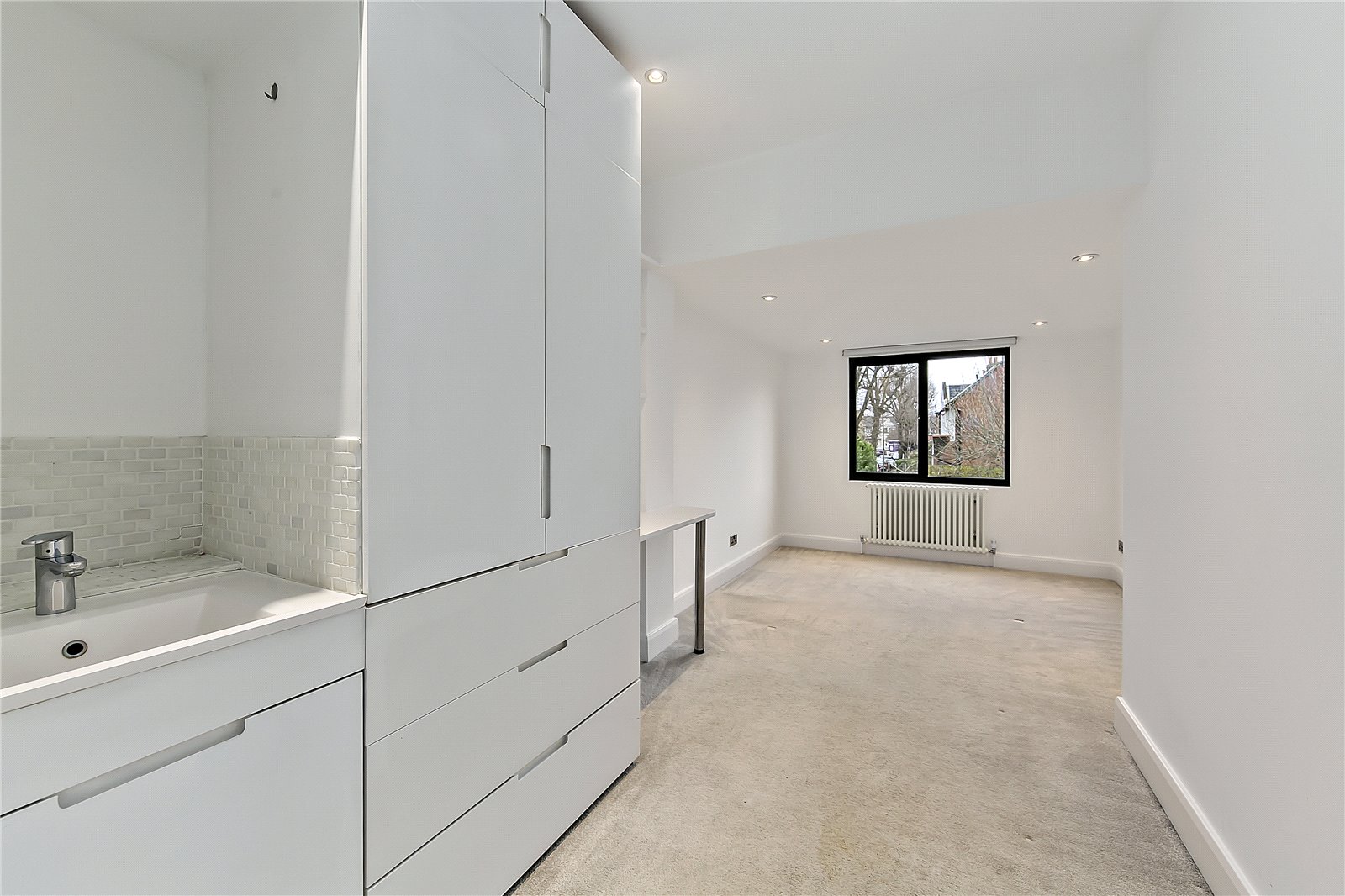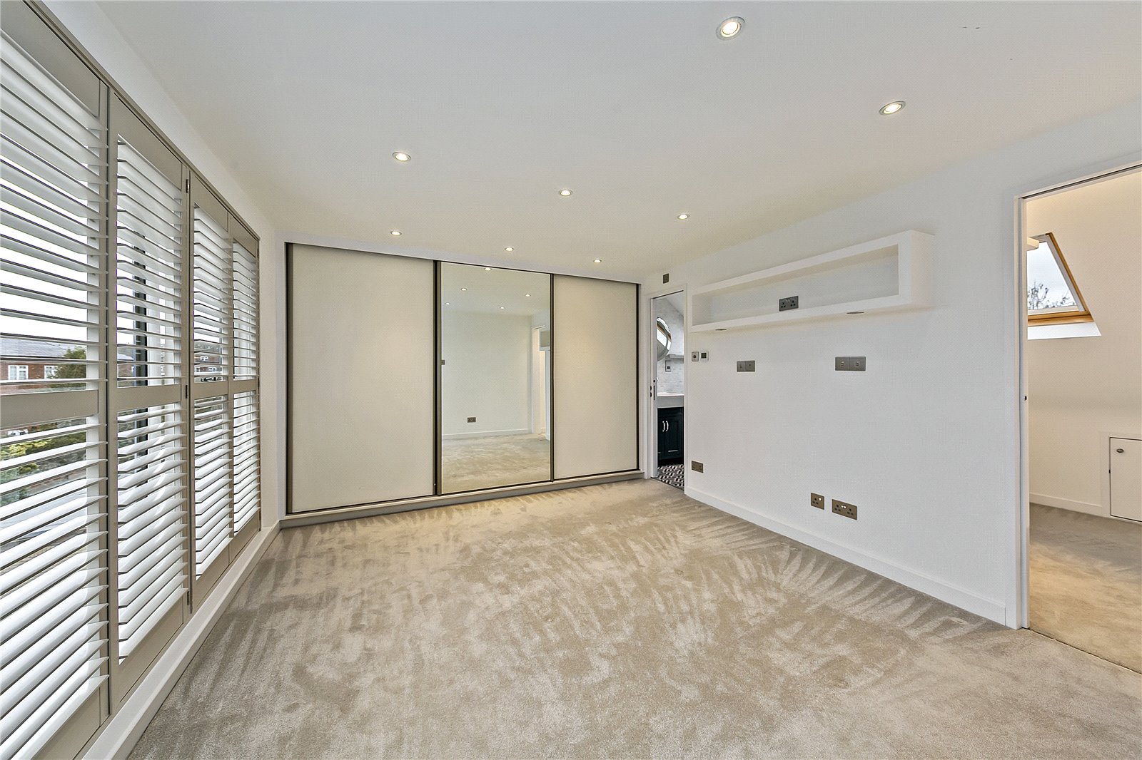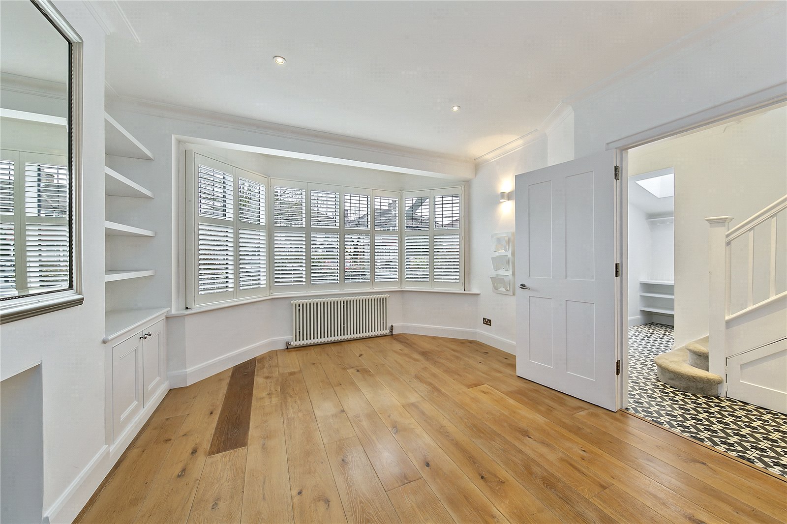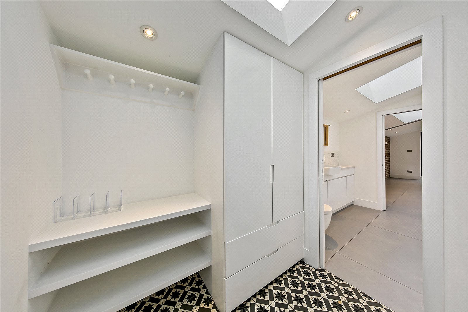 Upstairs, the first floor hosts three well-proportioned bedrooms along with a contemporary family bathroom. The top floor is dedicated to an impressive principal suite, flooded with natural light through full-height windows. This serene space includes generous built-in storage, a luxurious en-suite bathroom, and an additional room ideal for a nursery, dressing room, or home office.