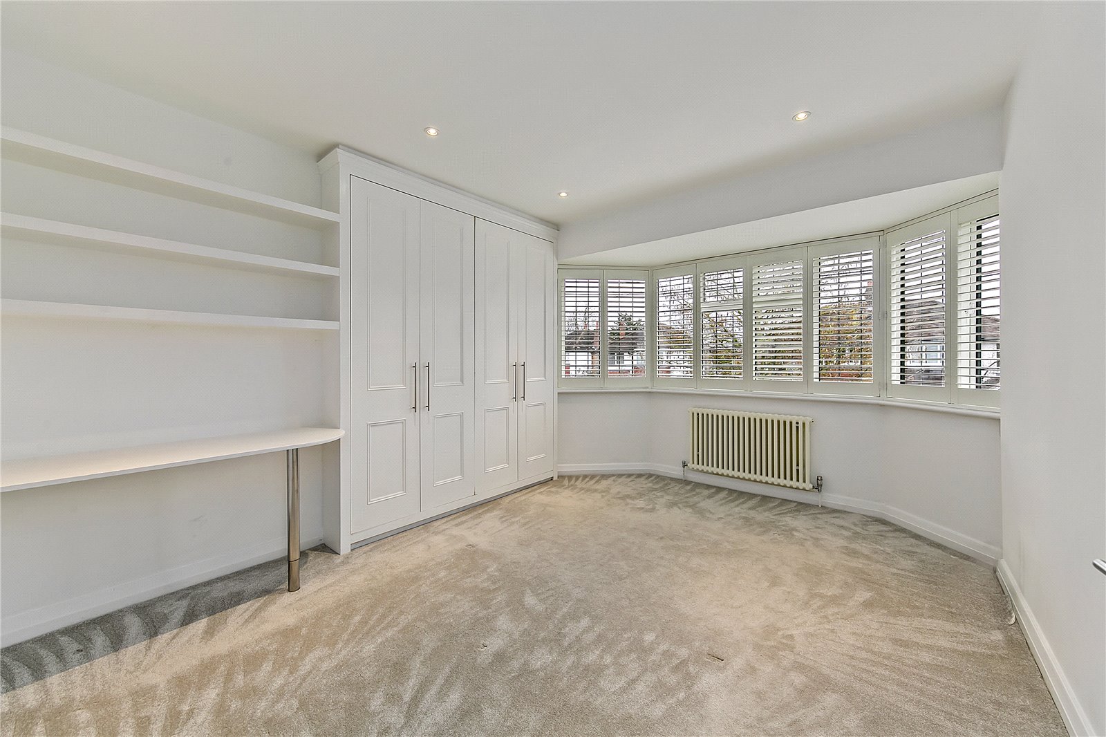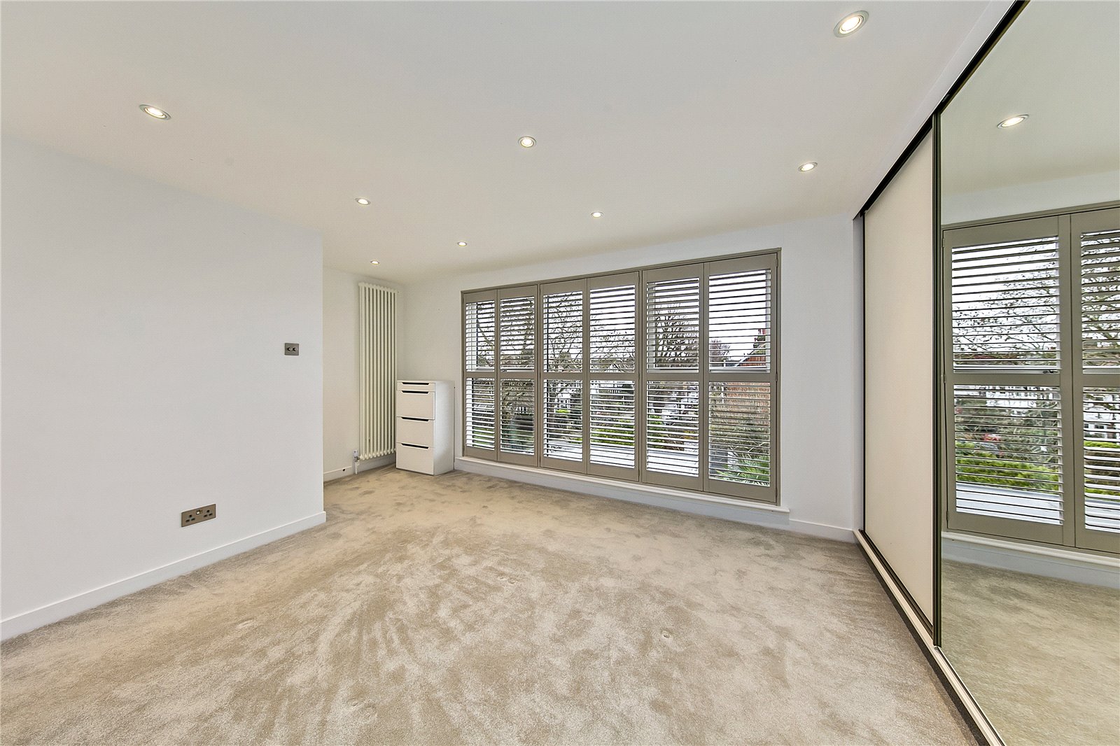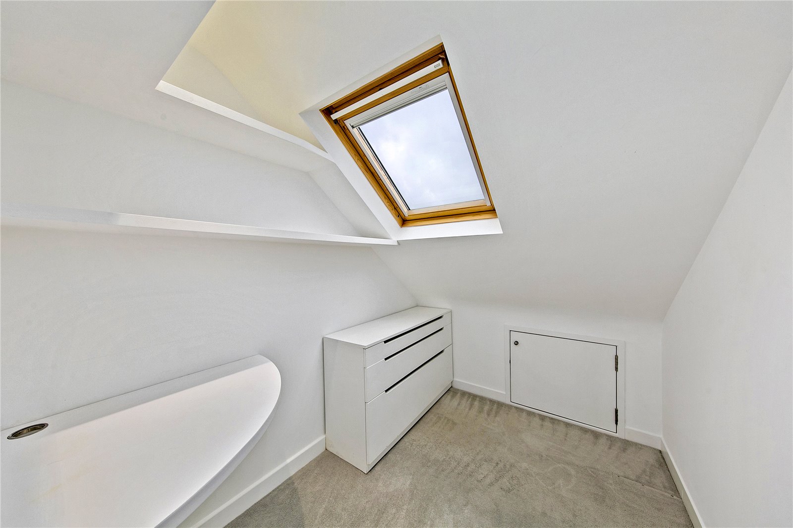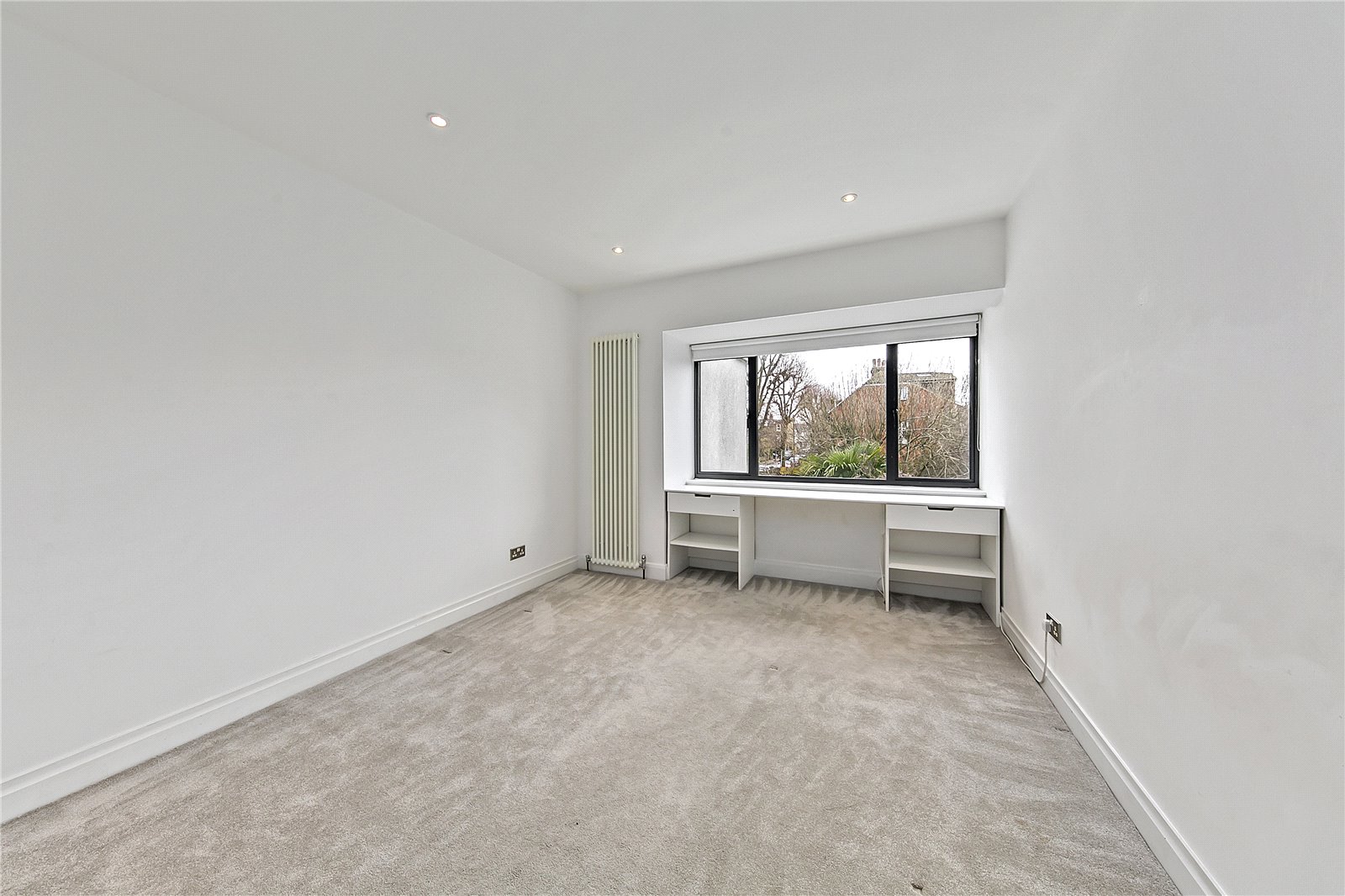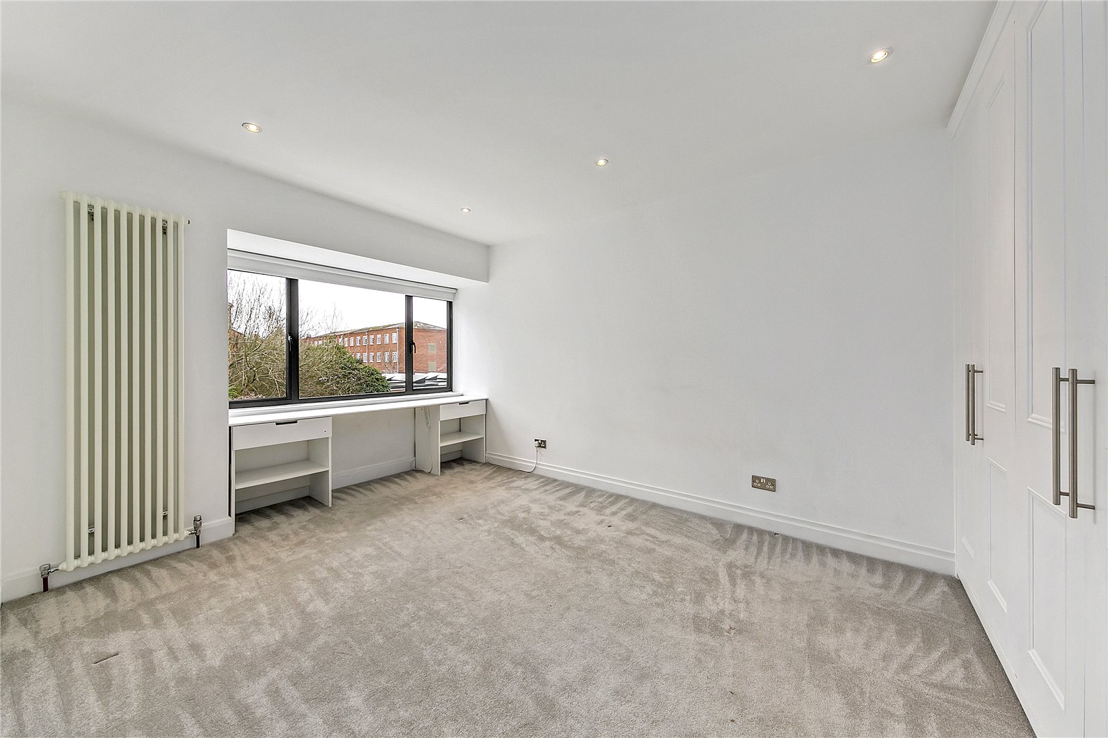Upstairs, the first floor hosts three well-proportioned bedrooms along with a contemporary family bathroom. The top floor is dedicated to an impressive principal suite, flooded with natural light through full-height windows. This serene space includes generous built-in storage, a luxurious en-suite bathroom, and an additional room ideal for a nursery, dressing room, or home office.