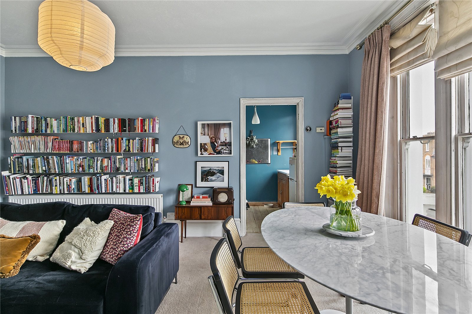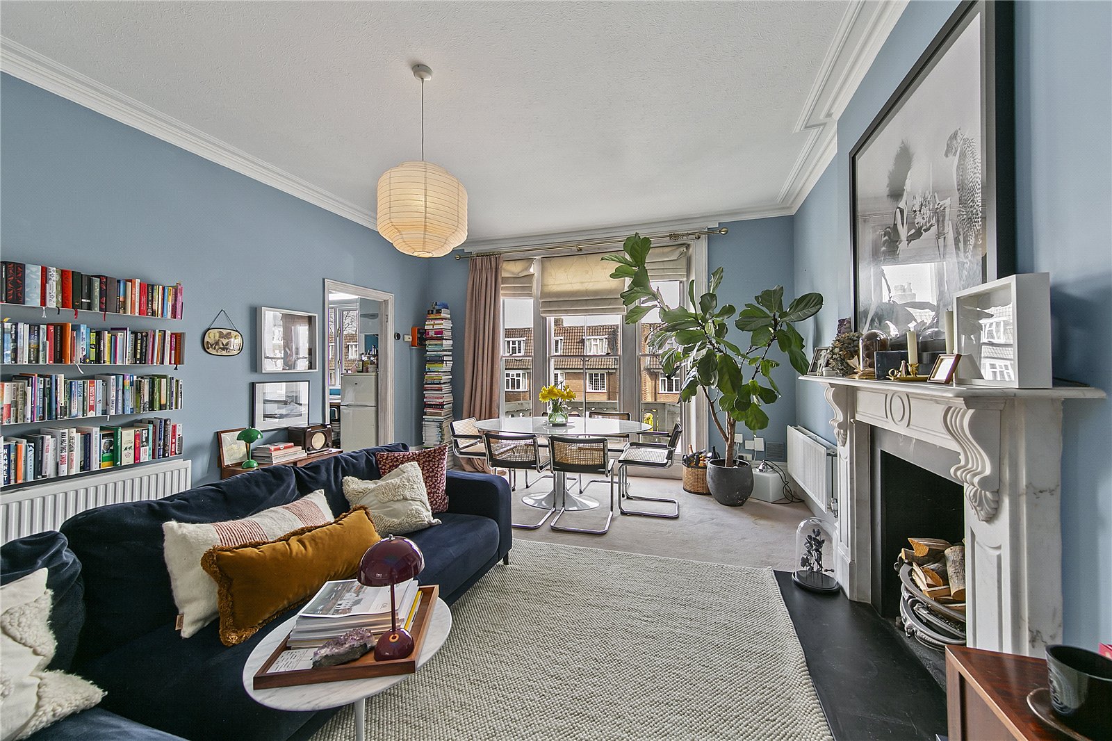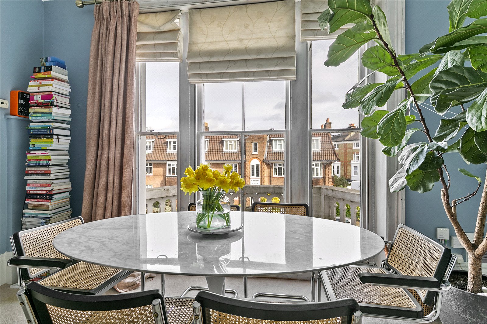 The lounge features floor-to-ceiling sash windows offering maximum natural light and which open onto a small balcony. There is also a lovely open fireplace with the original marble surround.
