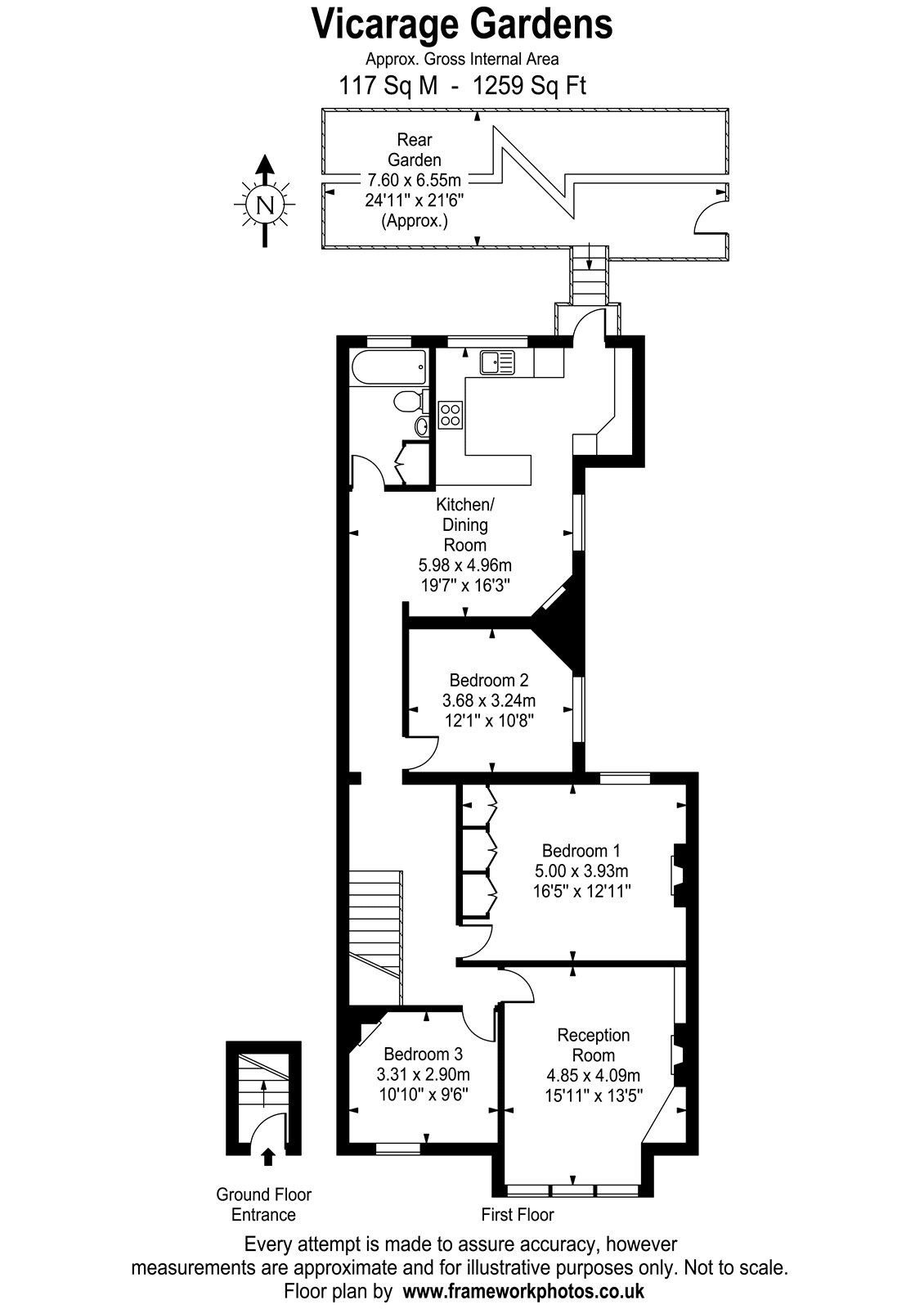 A garden with a storage shed is accessed via an outside staircase from the kitchen, and the property has the benefit of a share of the freehold and is offered with no chain.