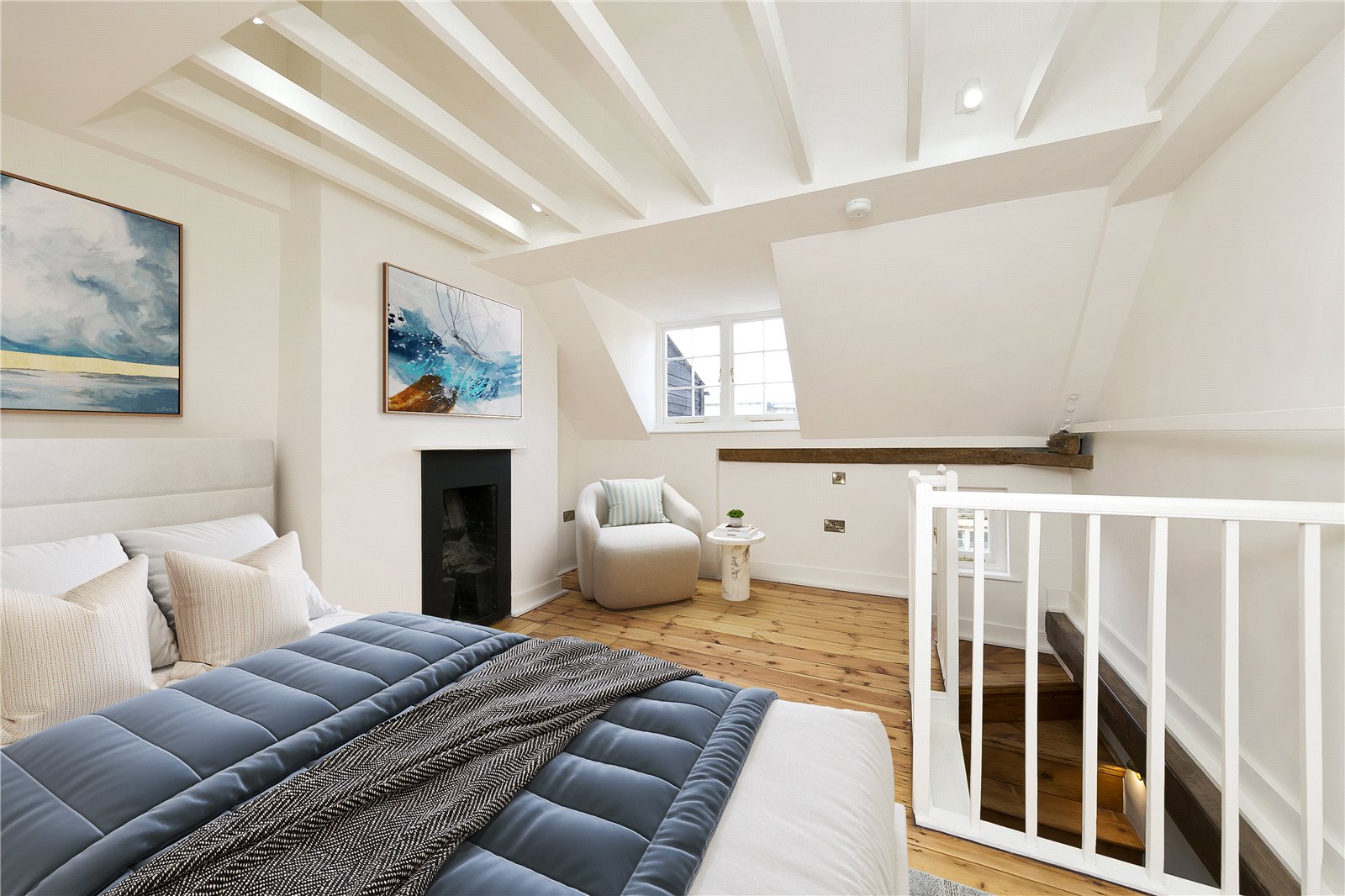 The ground floor provides a spacious reception room with wooden flooring leading into a light filled fully fitted kitchen with feature exposed brickwork, breakfast bar, range cooker and private patio area.
