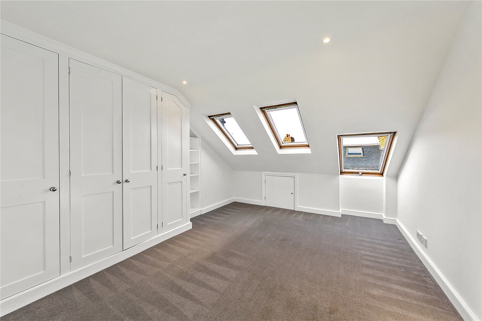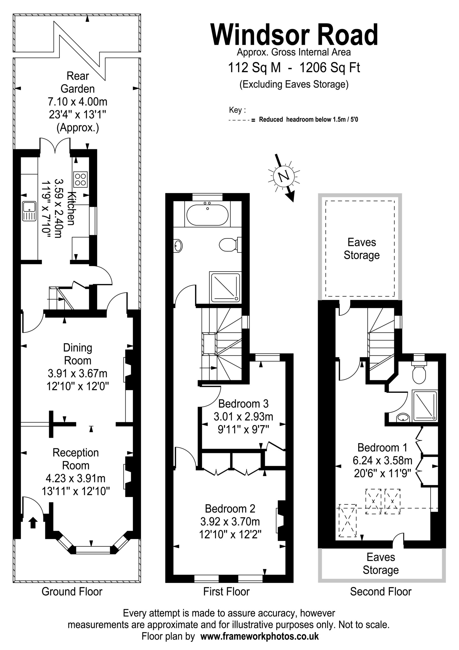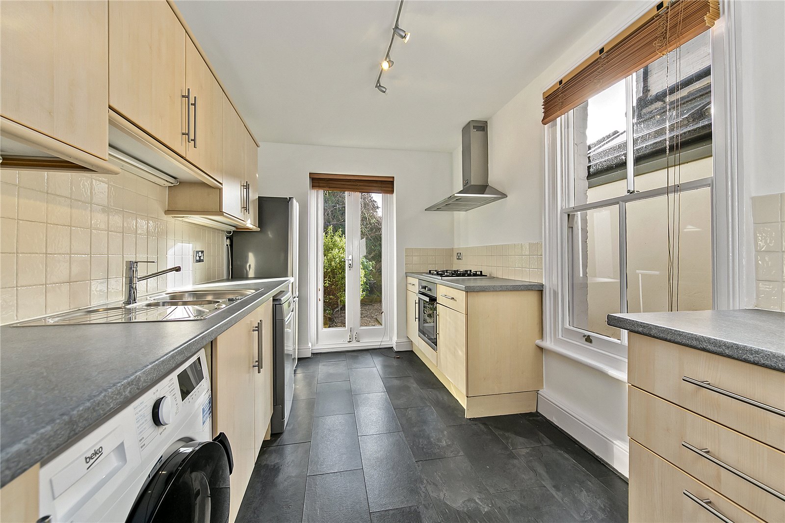 Spacious ground floor through reception room with feature fireplaces and wooden flooring leading to a lobby with outside access, modern kitchen with French doors to a delightful south facing garden. The first floor comprises a wonderful bathroom with separate shower, and two double bedrooms (one with excellent built in cupboards). The top floor offers a double bedroom with enviable space and a luxury shower room.